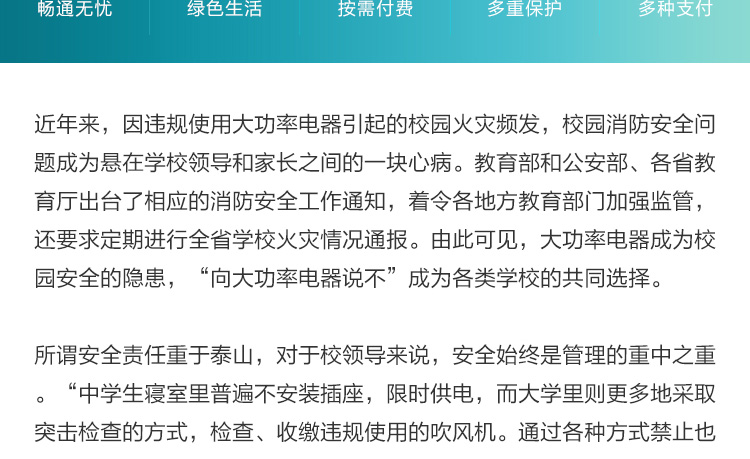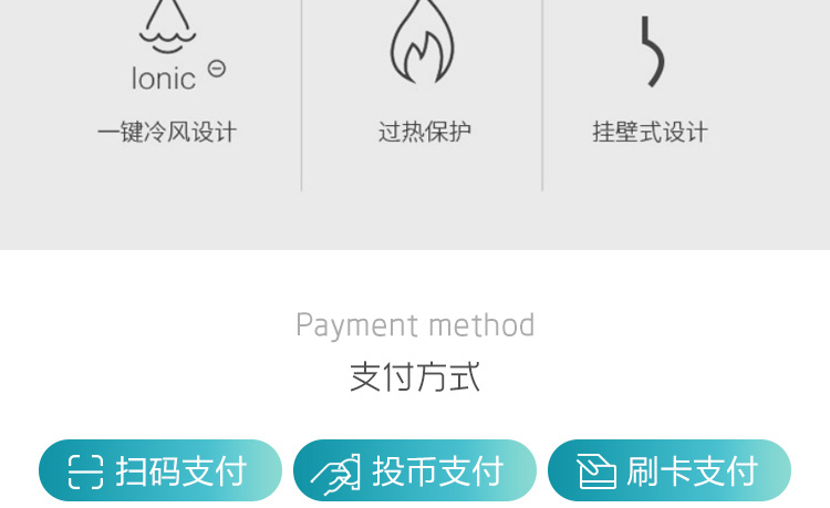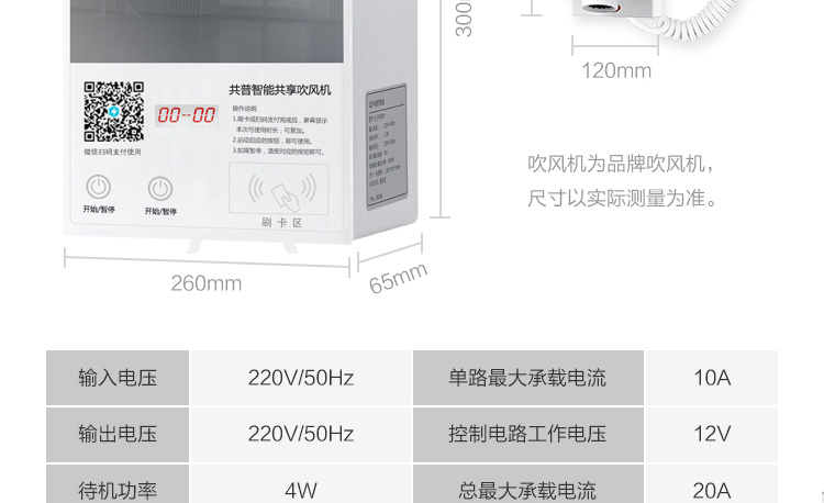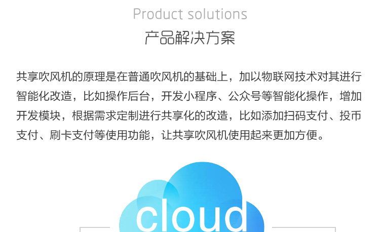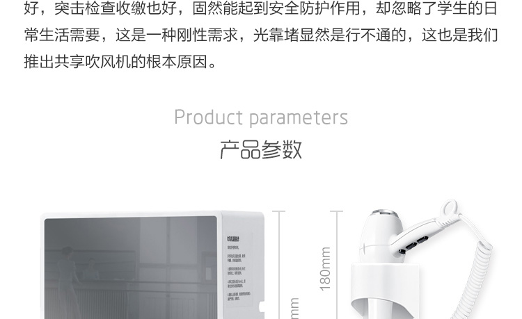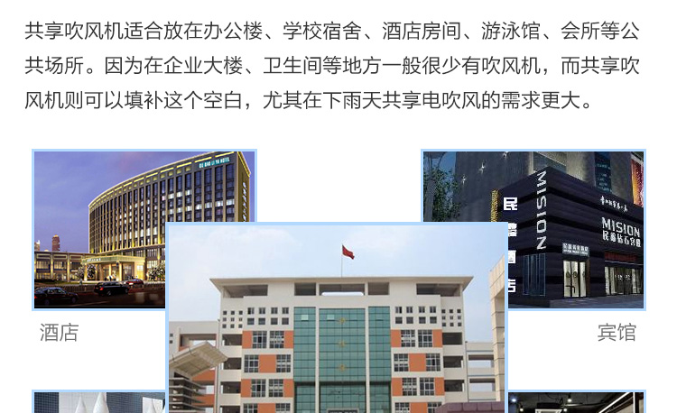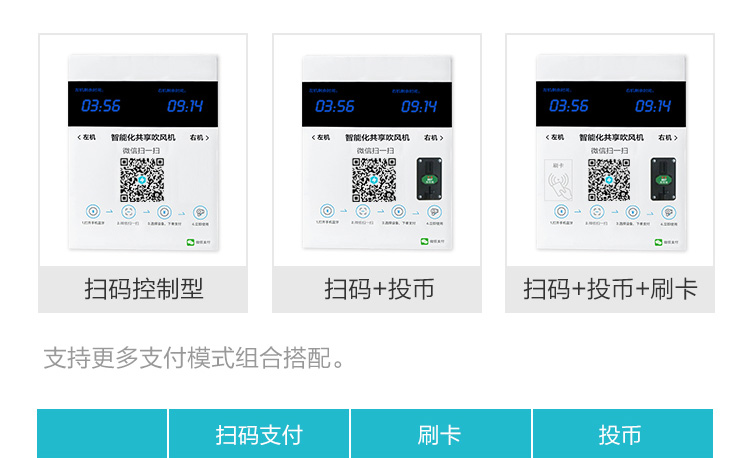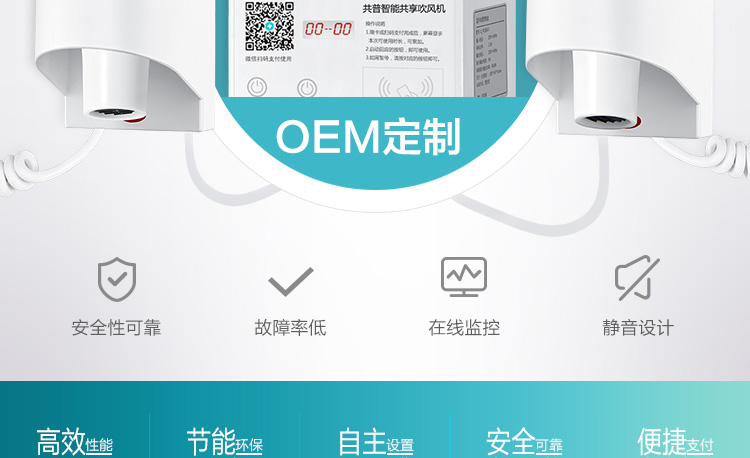 方案簡介: 為解決學(xué)校、工廠宿舍等人員居住量大的地方禁止使用大功率吹風(fēng)機(jī)的問題,共享吹風(fēng)機(jī)運(yùn)營商可以跟學(xué)校協(xié)調(diào)進(jìn)行統(tǒng)一安裝使用、統(tǒng)一管理,減少危險(xiǎn)情況的發(fā)生。產(chǎn)品可使用掃碼、刷卡、投幣的支付方式,滿足各種場景所需。